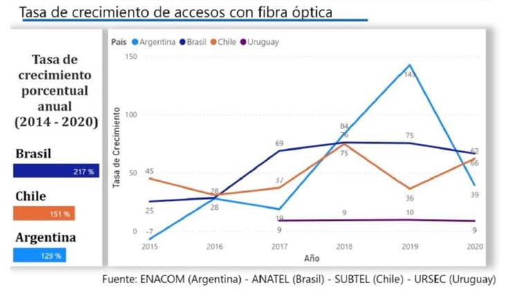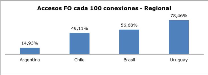 Con 1.472.246 accesos totales, la participación de las conexiones de fibra óptica sobre el total de conexiones de banda ancha en el país llega apenas al 14,93%, mientras que en Uruguay supera el 78%, Brasil el 56% y Chile el 49%.
