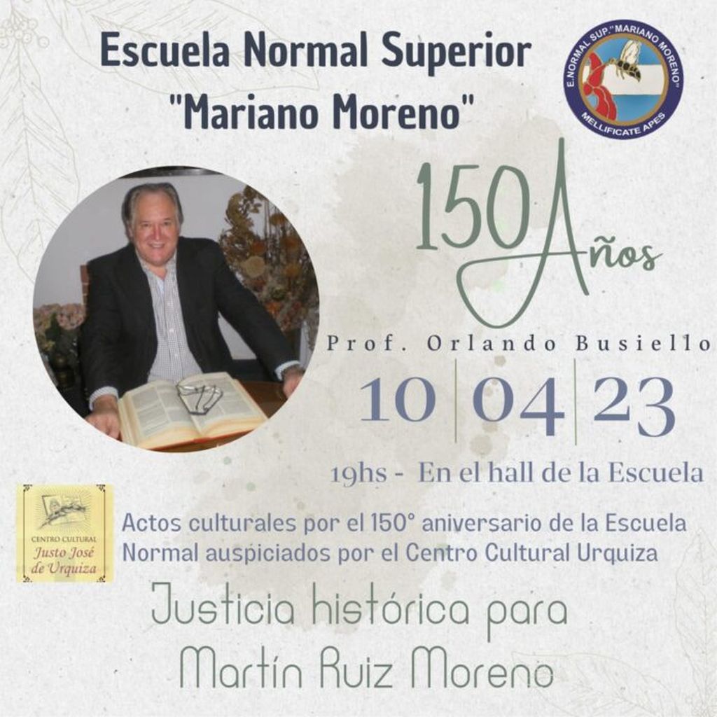 El historiador y docente Orlando Busiello ofrecerá una disertación titulada «Justicia para Martín Ruiz Moreno», en el marco de los festejos del 150° Aniversario de la Escuela Normal Mariano Moreno» de Concepción del Uruguay, auspiciada por el Centro Cultural Justo José de Urquiza.