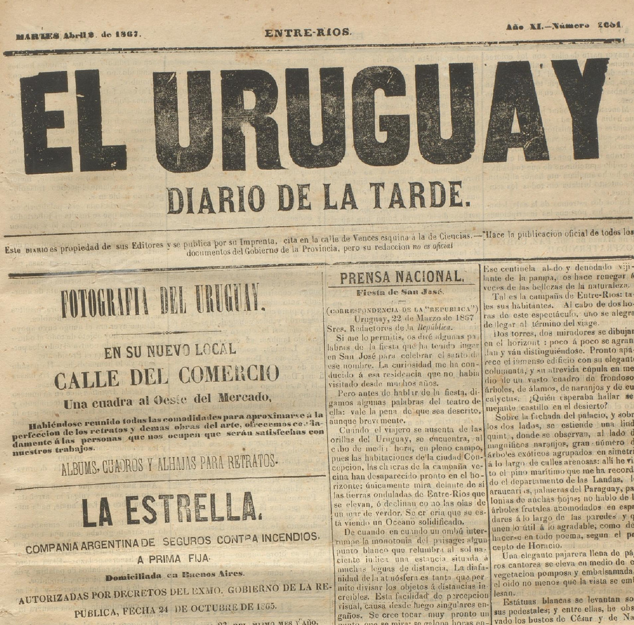 Imágenes: Fragmentos del periódico ‘El Uruguay’, correspondientes al año 1867, conservados en la Biblioteca Palacio San José, donde se puede apreciar la magnitud del evento y sus preparativos.