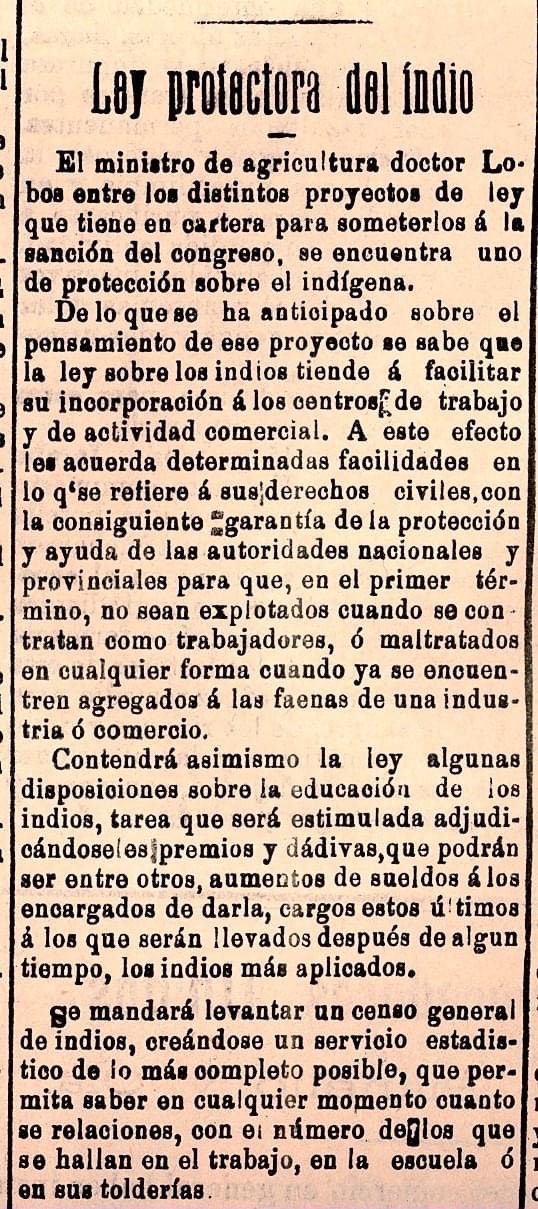 Un suelto aparecido en El Entre Ríos de Paraná el 20 mayo de 1921 informa sobre la presentación de un proyecto de Ley de “protección al indio”.