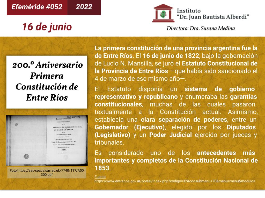 La Constitución de Entre Ríos fue la primera sancionada por una provincia argentina. Fue obra del Gobernador Lucio Norberto Mansilla quien dictó el “Estatuto Constitucional de la Provincia” el 16 de Junio de 1822.