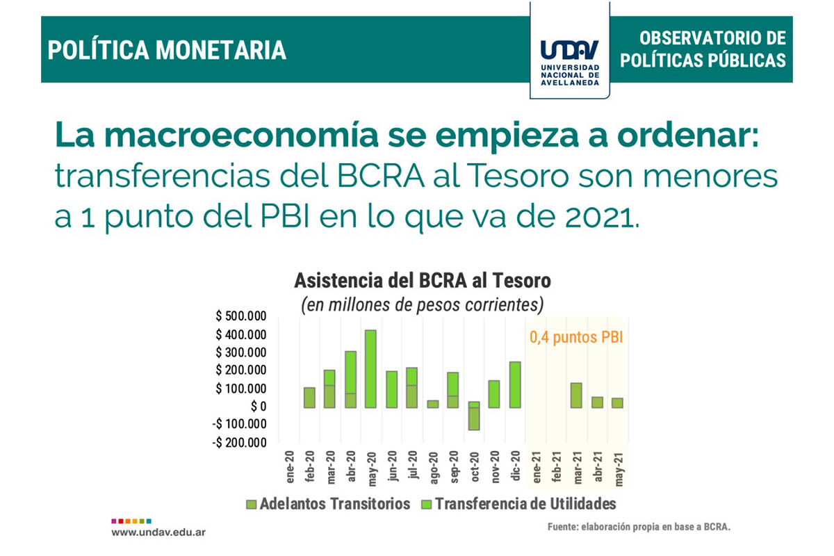 Por otra parte, los especialistas de la UNDAV celebran que “en abril del año 2021 la asistencia al Tesoro nacional alcanzó los $55.000 millones” y que “la base monetaria exhibió un retroceso a finales de abril del corriente año de $62.180 millones, con respecto al cierre del mes de marzo, y de $100.145 millones con relación a diciembre del año 2020”. Por eso, destacan, «las transferencias del BCRA al Tesoro Nacional son inferiores al 1% del PBI en lo que va del año».