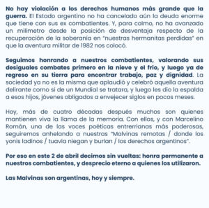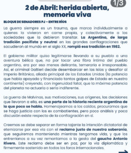 El ex intendente de Concepción del Uruguay y actual Senador provincial por el departamento Uruguay y jefe del bloque de Senadores de la Legislatura, Dr. Martín Oliva; acaba de publicar en las redes sociales esta Nota Abierta del Bloque de Senadores de la Legislatura del PJ, sobre el aniversario de la incursión en las Islas Malvinas, que ponemos a disposición de los lectores de La Ciudad: