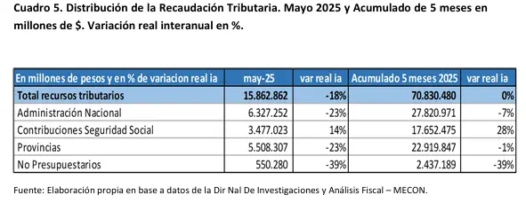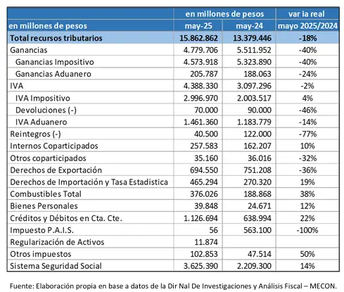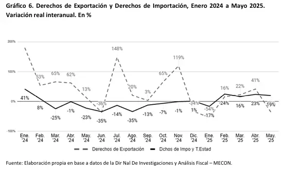 En mayo, último dato disponible, la recaudación tributaria alcanzó los $15,8 billones, evidenciando una caída real interanual del 17,9%, siendo el primer mes del año en el que la recaudación total presentó una variación negativa para dicha comparación. Puntualmente, impactó la pérdida de ingresos fiscales, sobre todo, en materia de comercio exterior vía IVA aduanero y Derechos de Exportación, y se sumó un retroceso en Ganancias.