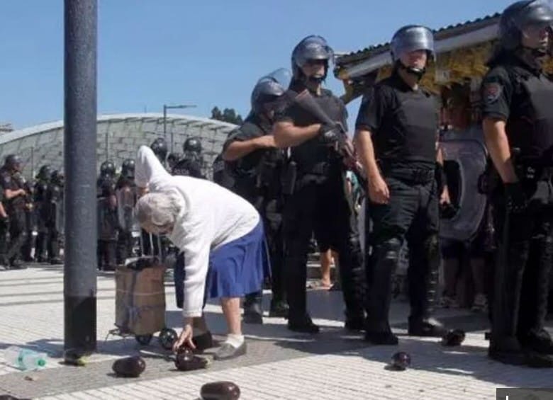 La foto muestra a una señora mayor juntando verduras del piso. Está rodeada por policías fuertemente armados. Ayer se conoció que la inflación en el país llegó al 50% interanual. En febrero, todavía es peor.