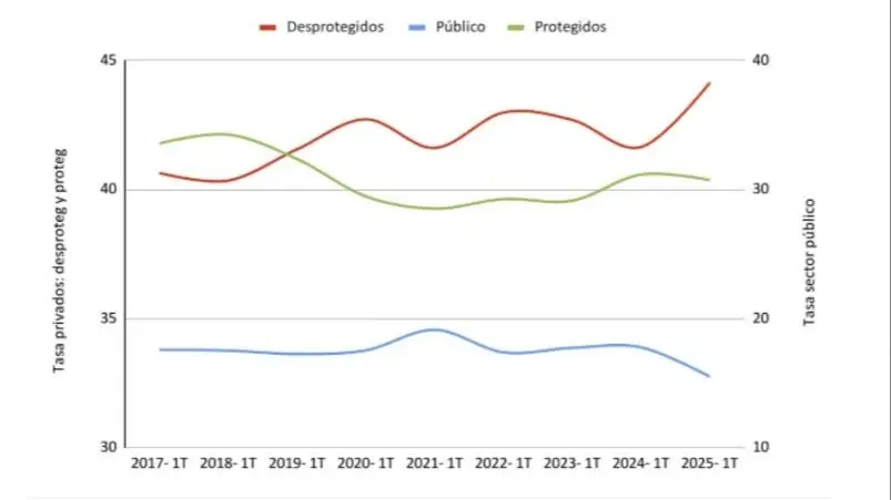 La tasa de trabajo protegido descendió del 40,5 al 40,3 por ciento, mientras que la tasa de empleo público se ubica en 15,5 por ciento, con una retracción del 12 por ciento a lo largo del último año. “Este es el valor más bajo para un primer trimestre en la serie 2017–2025”, señala el informe del Instituto Argentina Grande.