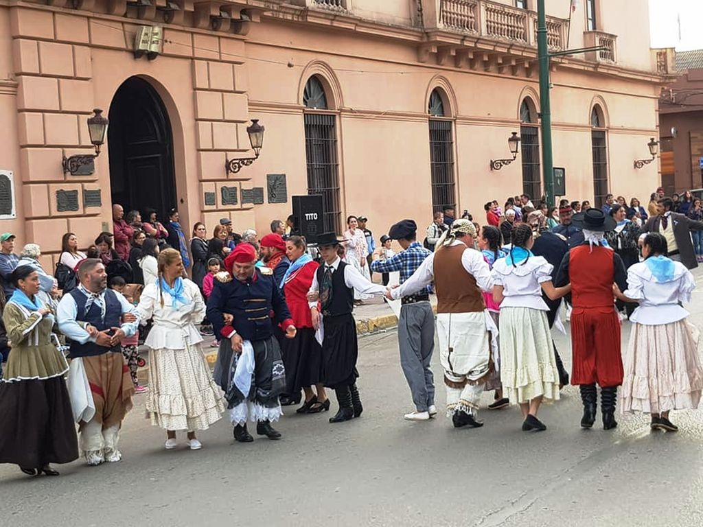 Los bailarines fueron dibujando sobre el asfalto cada una de las figuras de -El Pericon- Esto sucedía en Plaza Ramírez, durante la tarde del 9 de julio, de manera semejante a lo que ocurría en numerosos puntos del país, en celebración de los 203 años de la Declaración de la Independencia.