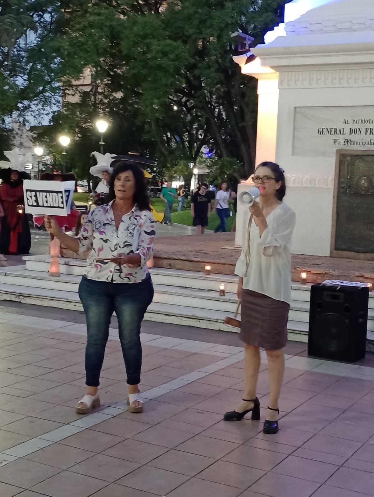 Las actrices Patricia Miotto y Carina Resnisky interpretando una perfomance del remate de edificios y monumentos históricos que son parte del patrimonio uruguayense.Participó un grupo de improvisación teatral uruguayense que se llama «El Clap», hicieron una lectura- megáfono en mano- a cargo de Patricia Miotto y Nancy Quinodóz. Leyeron el documento que se reproduce al final de la nota.
