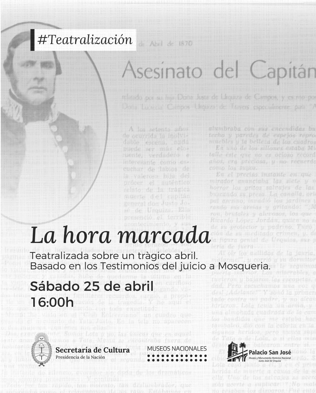 Este sábado 25, abrimos las puertas del tiempo. Te invitamos a ver “La hora marcada”, una representación teatralizada que sobre los trágicos sucesos del 11 de abril de 1870.