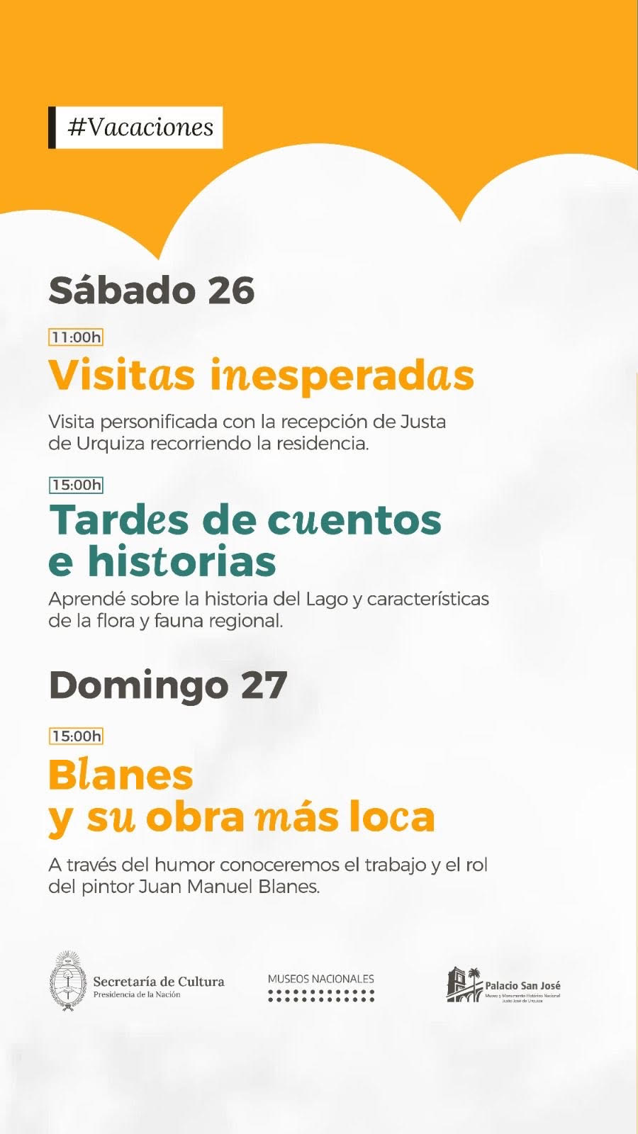 La entrada a todas las actividades es libre y gratuita. Se invita a la comunidad a participar y disfrutar del patrimonio cultural y natural del Palacio San José en un entorno pensado para grandes y chicos.