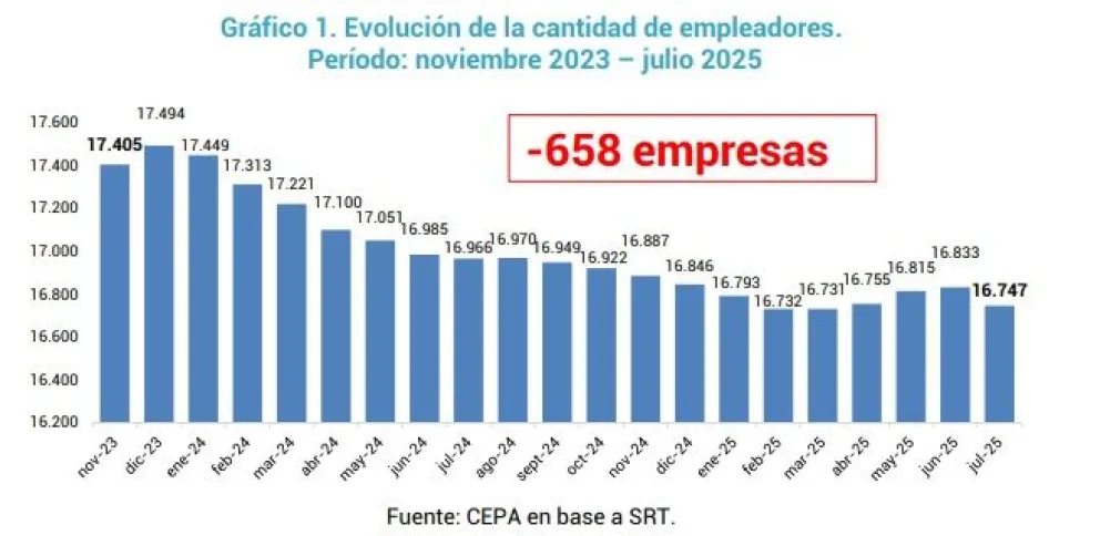 Según los datos de la Superintendencia de Riesgos del Trabajo (SRT), entre noviembre de 2023 y julio de 2025 la provincia registró una pérdida neta de 658 empleadores, lo que representa una contracción del 3,8% en la cantidad de empresas.