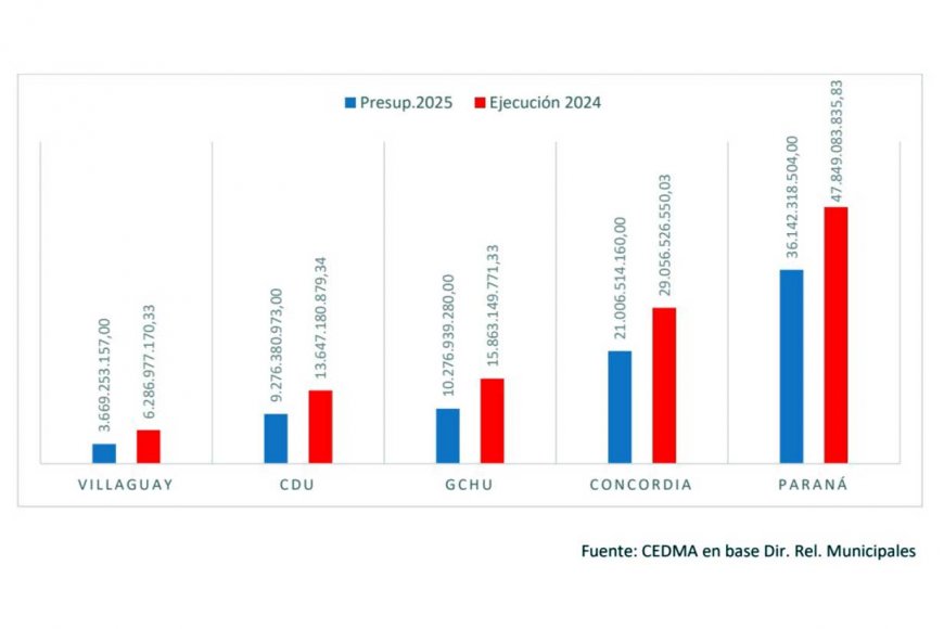 El exfuncionario puntualizó que la ciudad de Paraná tendría una “pérdida nominal en comparación con lo ejecutado hasta el momento del 24,5%. En términos absolutos la merma de recaudación alcanzaría a 11.706 millones de pesos. En cambio, Concordia resignaría en coparticipación un total de 8.050 millones de pesos, representando una caída del 27,7%. Por su parte, Gualeguaychú, tiene presupuestado para el año 2025, 10.276 millones de pesos, representando un 35% menos de la ejecución del año 2024. Por último, Concepción del Uruguay y Villaguay, reflejan una caída del 32% y 41% respectivamente”.