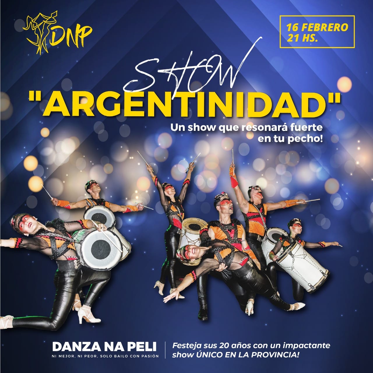 “Argentinidad”-Un show que resonará fuerte en tu pecho, de Danza na Peli, en el marco de su 20° aniversario. Dos funciones: 21 y 22.30 en el Auditorio Municipal “Carlos María Scelzi”. Las entradas anticipadas pueden adquirirse en la academia “Danza na Peli”, ubicada en Bv. Yrigoyen 1.070, o comunicándose al teléfono 15545121; costo $ 250. Venta de entradas en puerta: $ 350.