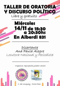 El miércoles 14, la Agrupación Julieta Lanteri organiza una charla-taller sobre Oratoria y Discurso Político que estará a cargo de la Locutora Nacional, periodista y colaboradora esporádica de La Ciudad, Ana Paula Alegre.