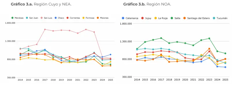 En el Noreste Argentino (NEA), todas las provincias, excepto Corrientes, arrojaron aumentos en 2025 respecto del año anterior, en tanto que Misiones continuó entre las jurisdicciones con los salarios más bajos del país. En relación a 2014, Chaco es la única provincia que tuvo un aumento real del salario. En la región Noroeste (NOA), se observa que los salarios docentes cayeron este año en Salta, Catamarca y Tucumán y todas las provincias de la región se mantienen por debajo de los niveles de 2023 en términos reales. En relación a 2014, la totalidad, excepto Santiago del Estero, se encuentran en niveles salariales inferiores.