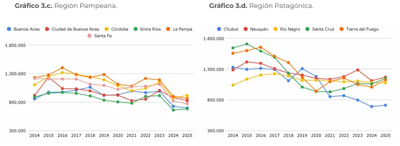 En el detalle por regiones del país, los especialistas señalaron que en Cuyo, todas las provincias presentan una caída del gasto (aunque San Luis mantuvo a lo largo de toda la década tasas de crecimiento mayores al resto de las provincias), en el NEA todas las jurisdicciones, excepto Chaco, registraron una caída. Por su parte, el NOA mostró una disminución del gasto generalizada, con excepción de Santiago del Estero. En la región Pampeana, también se observaron mermas en todos los casos. Por su parte, en la Región Patagónica, Chubut, Río Negro, Santa Cruz y Tierra del Fuego anotaron caídas en 2024 frente al año previo, mientras que Neuquén es la única que presentó un incremento en el mismo período.
