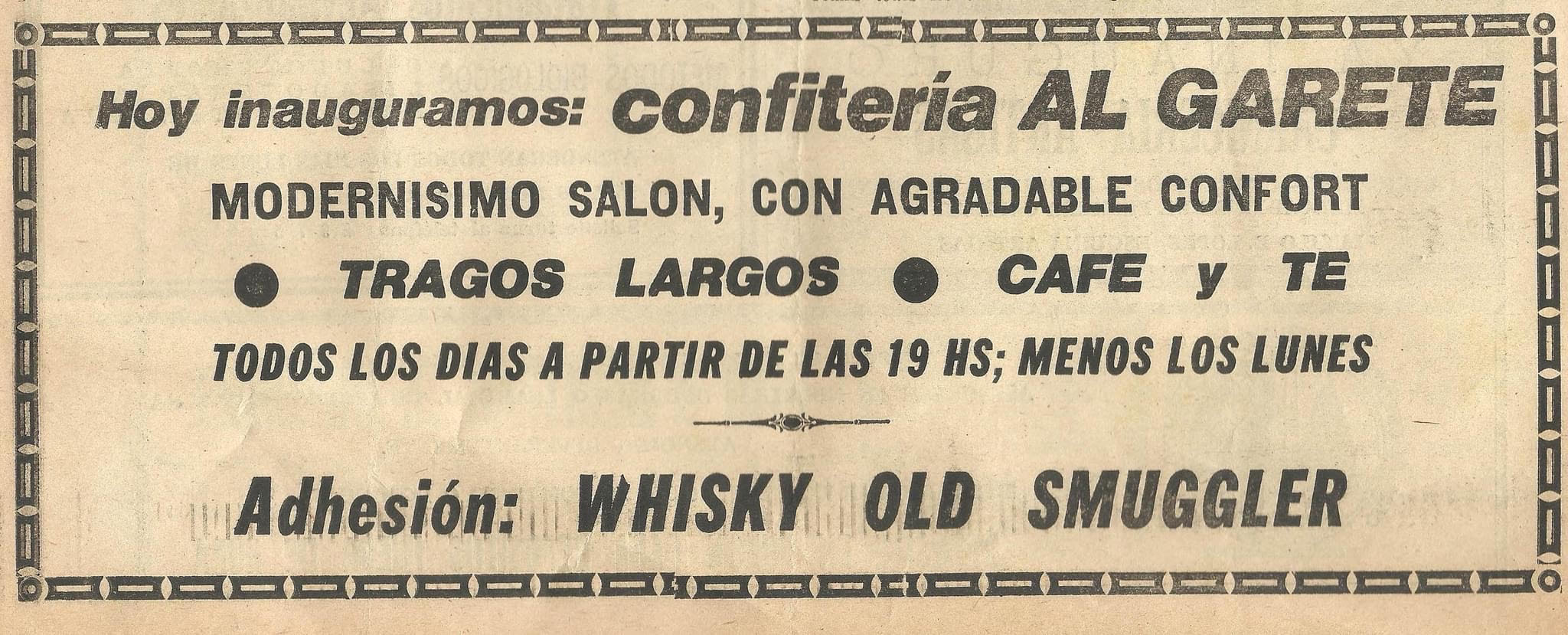 Más allá de ser conocido como como discoteca o boliche nocturno, también fue confitería, como se puede ver en una publicidad aparecida en diario “La Calle” el 28 de julio 1974, “Hoy inauguramos: confitería Al Garete. Modernísimo salón con agradable confort. Tragos largos, café y té. Todos los días desde las 19 horas, menos los lunes”.
