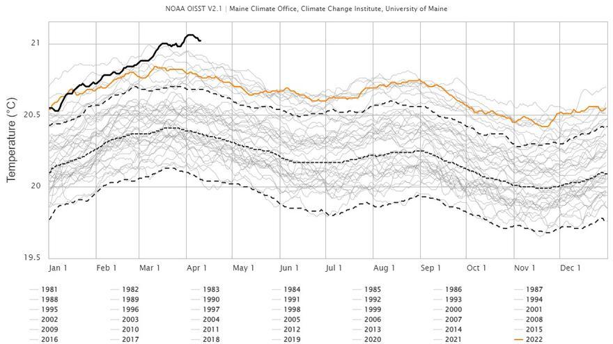 La temperatura media de la superficie de los océanos del planeta llegó a 21,1 grados entre los pasados 1 y 6 de abril, lo que supone un nuevo máximo histórico, aunque a continuación la temperatura ha descendido a 21ºC el lunes 10 de abril. La acumulación de calor en la superficie de los océanos ha sido casi lineal desde la década de 1980. En el gráfico, la línea negra marca la evolución de la temperatura en 2023, que se ha disparado desde enero. Se puede hacer un seguimiento de la temperatura de la superficie de los océanos en este enlace, que se actualiza diariamente.