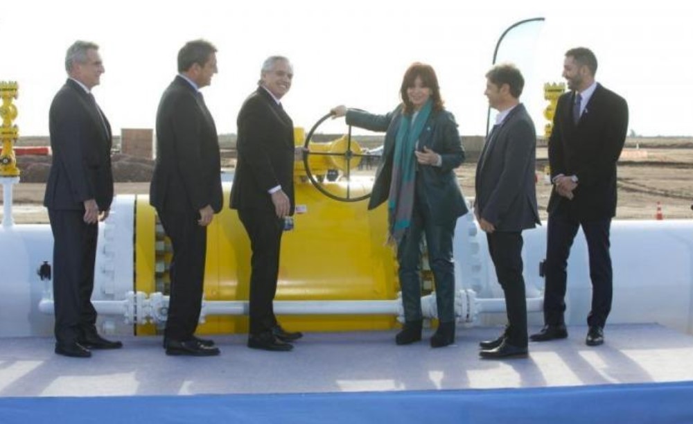 Cristina Kirchner, Sergio Massa, Alberto Fernández, Axel Kicillof y Agustín Rossi celebran la inauguración del gasoducto Néstor Kirchner.