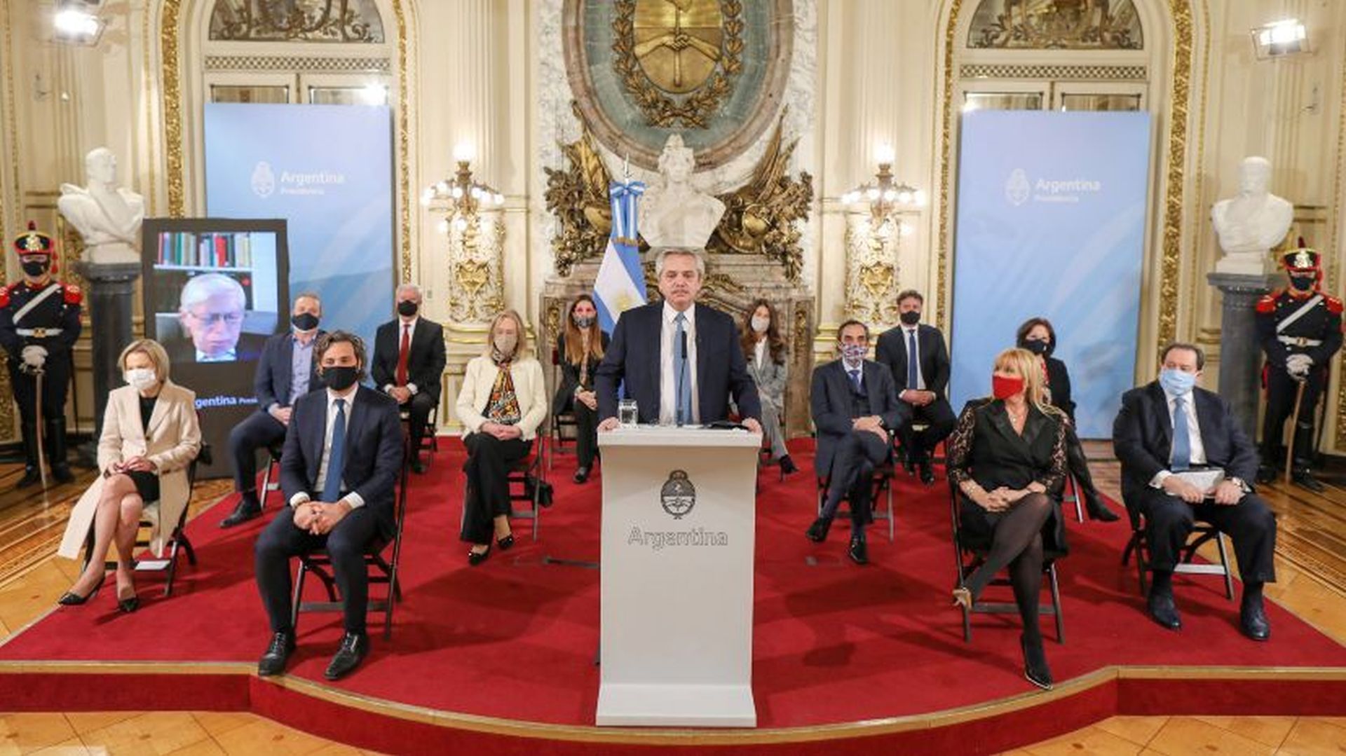 El mandatario estuvo rodeado por parte de su gabinete y también por los juristas que analizarán eventuales cambios a la Corte Suprema y al Consejo de la Magistratura, entre otros puntos. Estuvo también presente Elena Highton de Nolasco por parte de la Corte y consejeros como Alberto Lugones y Diego Molea. También hubo varias ausencias, incluyendo el faltazo de la oposición, que rechazó la iniciativa sin leerla y la presunta ampliación del máximo tribunal, cosa nunca anunciada.