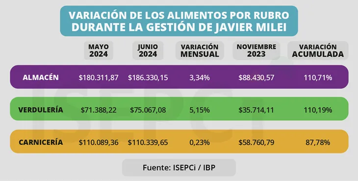 En junio, los productos de verdulería siguieron marcando el ritmo de los mayores aumentos: subieron 5,15%. Los de almacén aumentaron 3,34% y las carnes 0,23%. Respecto a noviembre del año pasado el almacén lidera los incrementos con 110,71%, seguido por frutas y verduras con 110,19% mientras las carnes subieron 87,78%.