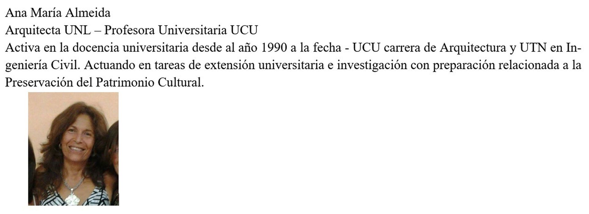 Pero ¿Quién es Ana María Almeida? Ana María es una jóven arquitecta uruguayense egresada de la UNL y profesora universitaria UCU, por otro lado tiene una activa participación en la docencia universitaria desde al año 1990 a la fecha en la UCU carrera de Arquitectura y en la UTN en Ingeniería Civil. También viene llevando a cabo tareas de extensión universitaria e investigación con preparación relacionada a la Preservación del Patrimonio Cultural.