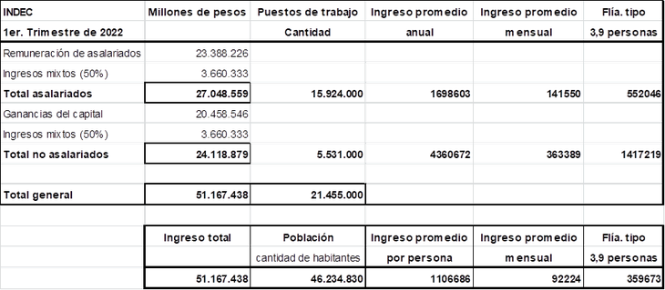De la tabla precedente se desprende que el ingreso mensual promedio por asalariado es de $ 141.550 y, el del excedente $ 363.389.- por no asalariado.