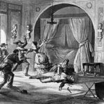 En eso, los asaltantes, que eran cinco no más, pues aunque entraron al Palacio ciento cuatro, los otros enderezaron a la guardia y a asegurar las entradas desembocan en el patrio y al verlos les gritó: “No se mata así a un hombre entre su casa, canallas” y les disparó un tiro; la bala le pasó rozando el bigote a un cordobés Álvarez y fue a quebrarle el hombro al negro Luna, otro de los que venían.