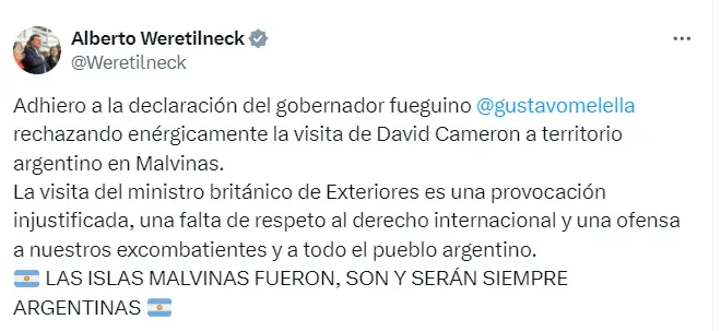 «La visita del ministro británico de Exteriores es una provocación injustificada, una falta de respeto al derecho internacional y una ofensa a nuestros excombatientes y a todo el pueblo argentino», publicó Weretilneck en su cuenta personal de X.