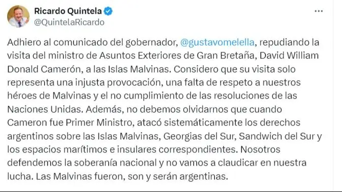 Por su parte, Quintela aseguró que los argentinos «no debemos olvidarnos que cuando Cameron fue Primer Ministro, atacó sistemáticamente los derechos argentinos sobre las Islas Malvinas, Georgias del Sur, Sandwich del Sur y los espacios marítimos e insulares correspondientes. Nosotros defendemos la soberanía nacional y no vamos a claudicar en nuestra lucha. Las Malvinas fueron, son y serán argentinas».
