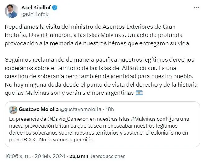 Al mismo tiempo que promulgaba un decreto para declarar persona no grata al canciller británico, el gobernador de Tierra del Fuego publicó un hilo en X para rechazar la llegada de Cameron a las Islas. «La presencia de David Cameron en nuestras Islas Malvinas configura una nueva provocación británica que busca menoscabar nuestros legítimos derechos soberanos sobre nuestros territorios y sostener el colonialismo en pleno S.XXI. No lo vamos a permitir», dijo y agregó: «En tanto persista la usurpación británica de nuestro territorio y el Reino Unido siga rehusándose a reanudar las negociaciones que la Comunidad Internacional establece para devolvernos lo que por historia y derecho nos pertenece, no descansaremos en nuestra lucha».