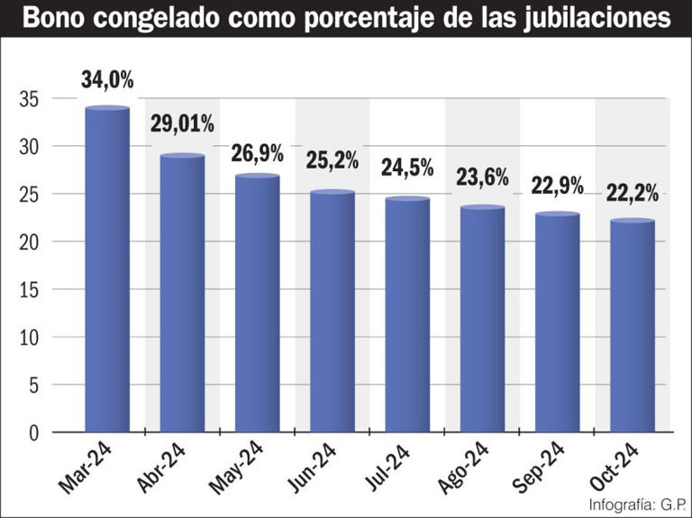 A esto se suma que el bono compensatorio, congelado desde marzo, está perdiendo valor frente a la inflación. En términos reales, la última actualización apenas alcanzó un 1,2%, mientras que la inflación interanual supera el 100%. Esto implica que, de marzo a octubre, el complemento ha disminuido como proporción del haber mínimo, pasando del 34% al 22,2%.