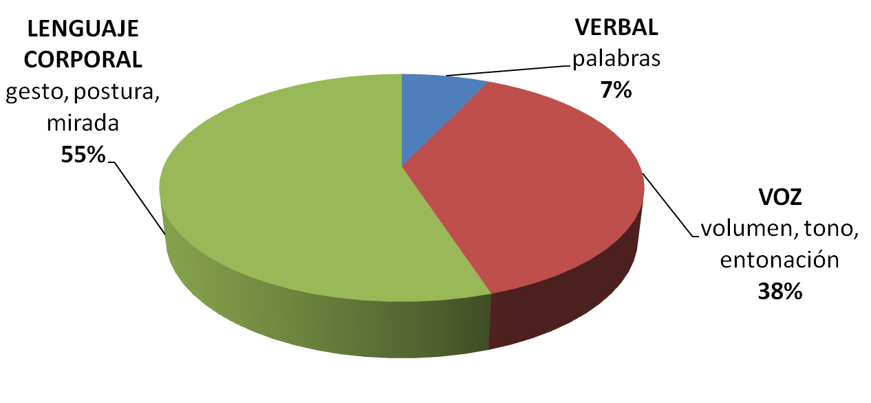 No está demás mirar el cuadro que acompaña el artículo, donde -a nivel de portentajes- se establece como se percibe lo que estamos tratando de comunicar a nuestros interlocutores. Es impactante ver que solo el 7% de nuestro discurso corresponde a las palabras que estamos trasmitiendo, el 38% a la voz (como lo decimos, la entonación, etc.) y el 55% a la postura corporal (gestos, mirada, postura).