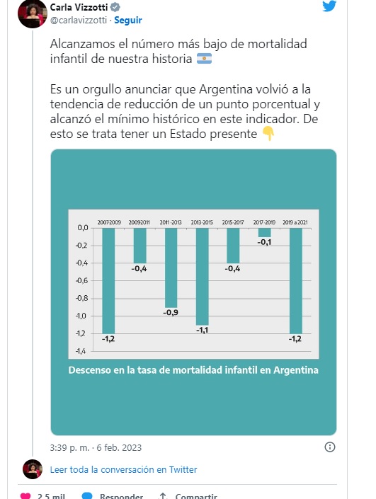 «Alcanzamos el número más bajo de mortalidad infantil de nuestra historia. Es un orgullo anunciar que Argentina volvió a la tendencia de reducción de un punto porcentual y alcanzó el mínimo histórico en este indicador. De esto se trata tener un Estado presente», escribió Vizzotti en esa red social.
