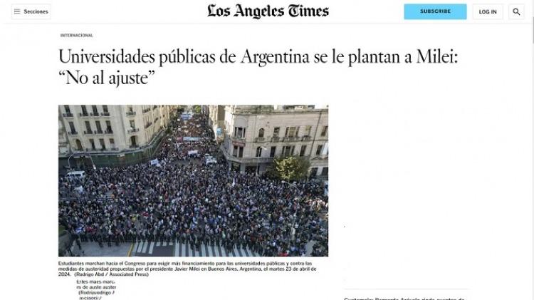 El medio estadounidense Los Ángeles Times,en su edición en español, tituló: «Universidades públicas de Argentina se le plantan a Milei: ‘No al ajuste'».