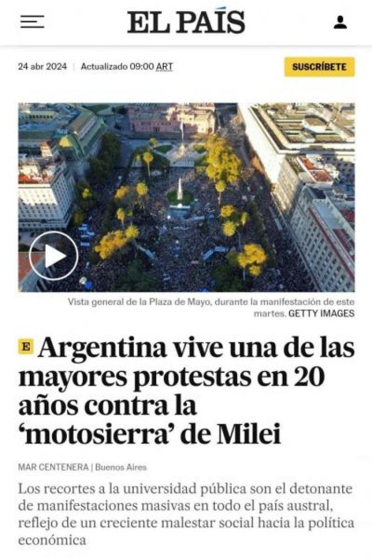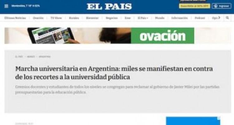 El medio El País de España abría en la noche su sitio web de noticias con el título: “Las universidades argentinas marchan en defensa de la educación pública”. “Cientos de miles de personas salen a las calles contra el recorte presupuestario del 70% realizado por Milei. El presidente acusa a los docentes de “adoctrinamiento” y “lavado de cerebro”. En la mañana de este miércoles, en grande la nota central decía: «Argentina vive una de las mayores protestas en 20 años contra la ‘motosierra’ de Milei«.