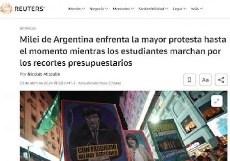 Desde la agencia de noticias británica Reuters titularon:“Milei de Argentina enfrenta la mayor protesta hasta el momento mientras los estudiantes marchan por los recortes presupuestarios”. “Cientos de miles de argentinos salieron a las calles de Buenos Aires el martes en una marcha antigubernamental contra los recortes presupuestarios a las universidades públicas, la mayor protesta hasta el momento contra las dolorosas medidas de austeridad del presidente Javier Milei”, escribieron.