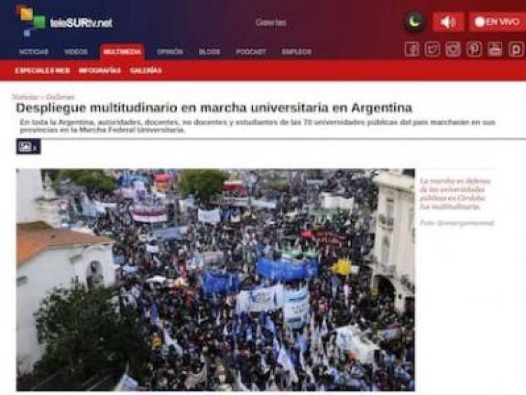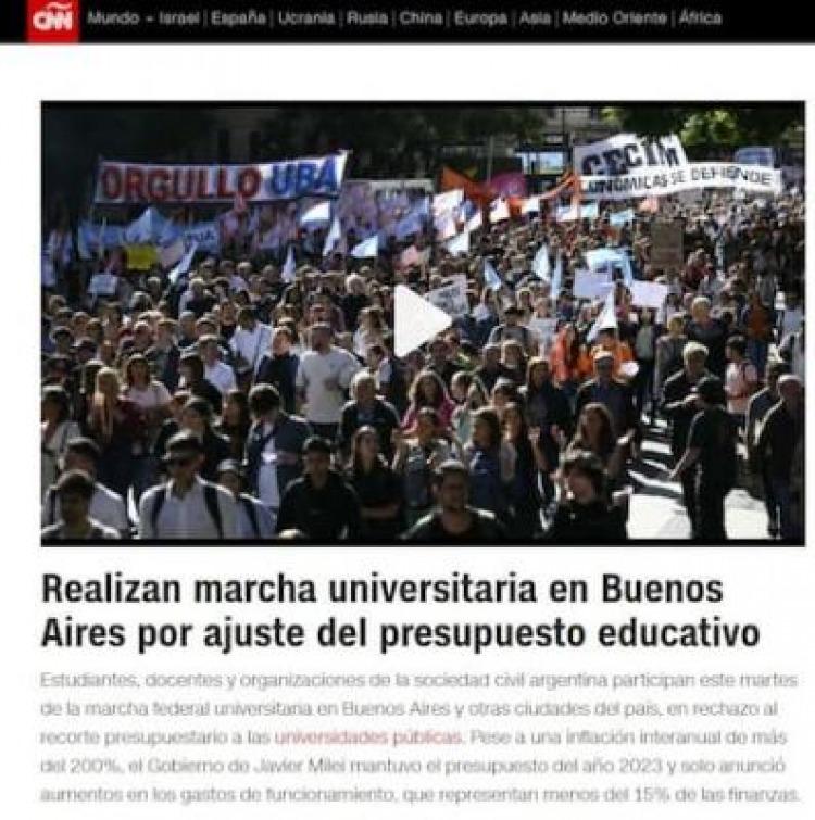 El medio CNN en español, también cubrió la movilización y tituló: “Realizan marcha universitaria en Buenos Aires por ajuste del presupuesto educativo”. En el cuerpo de la nota escribieron: “Estudiantes, docentes y organizaciones de la sociedad civil argentina participan este martes de la marcha federal universitaria en Buenos Aires y otras ciudades del país, en rechazo al recorte presupuestario a las universidades públicas. Pese a una inflación interanual de más del 200%, el Gobierno de Javier Milei mantuvo el presupuesto del año 2023 y solo anunció aumentos en los gastos de funcionamiento, que representan menos del 15% de las finanzas”.