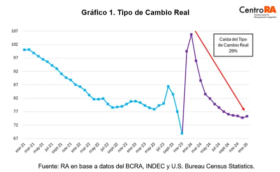 Al inicio de la gestión de Milei se implementó una devaluación de más del 54% en el tipo de cambio oficial que provocó, en principio, un aumento equivalente en el tipo de cambio real. Sin embargo, debido a la inflación desencadenada sumado a la desregulación de los precios, el tipo de cambio real se apreció nuevamente en el tiempo, registrando una caída del 29% entre enero de 2024 y enero de 2025 quedando, de hecho, por debajo del nivel previo a las elecciones presidenciales del 2023.