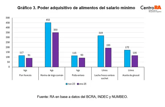 A modo de ejemplos concretos, tomando productos de primera necesidad, un salario mínimo permitió a una familia, en enero de 2025, adquirir 305 kilos de harina de trigo común esto es 102 kilos menos que en noviembre de 2023; además pueden comprar 193 litros de leche entera en sachet, una caída de 126 litros con respecto al inicio de la gestión libertaria. La compra de pollo entero con dicho ingreso, pasó de 115 kilos a fines del 2023 a 93 kilos en la actualidad (-22 kilos), a la vez que solo se pueden adquirir 91 kilos de pan francés (nov/24 117 kilos; -26 kilos) y el poder de compra en el caso del aceite de girasol se acotó a 56 litros (pasó de 172 a 116 litros).