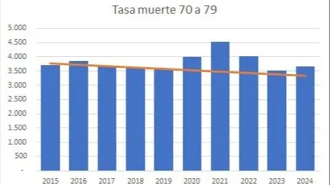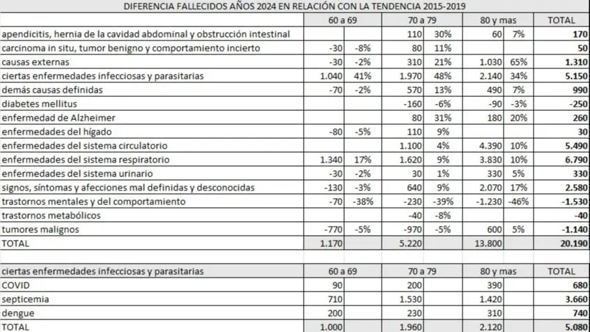 Un análisis de los fallecidos en la Argentina en los años 2020 a 2024 arroja nuevamente un dato preocupante: aumentó la mortalidad por casi todas las causas en mayores de 65, pero en especial en los mayores de 70. Algunos de esos aumentos son particularmente llamativos. Por ejemplo, las muertes por ciertas enfermedades infecciosas y parasitarias crecieron un 48% en los de 70 a 79, y un 34% entre los de 80 y más. Las originadas por “causas externas” (accidentes de transporte terrestre, aéreo y marítimo, ahogamiento, envenenamiento accidental, quemaduras, exceso de esfuerzo, exposición a fuerzas de la naturaleza, lesiones autoinfligidas, entre otras) aumentaron un 21% en el primer grupo y un 65% en el segundo; enfermedad de Alzheimer,  31% y 20% respectivamente.