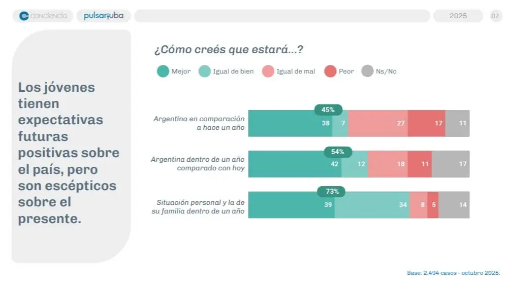 Los jóvenes, en especial los varones, constituyen el núcleo principal de apoyos de Javier Milei. En este estudio se percibe entre los consultados una visión moderadamente optimista sobre la situación actual, si se la compara con los últimos sondeos generales. Un 45% opinó que el país está mejor o igual de bien que hace un año, mientras que un 44% dijo que está igual de mal o peor. Casi un empate. Pero sobre el futuro las expectativas son más favorables: un 54% sostuvo una mirada positiva para la Argentina de aquí a un año y un 73% respecto de su situación personal y la de su familia. “Tienen expectativas positivas futuras sobre el país, pero son escépticos sobre el presente”, analizaron en el trabajo.