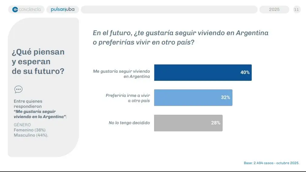 Para chicos de entre 16 y 19 años, como los que participaron del trabajo, la perspectiva de irse al exterior siempre está latente, en especial en épocas difíciles. Un 40% respondió que le gustaría seguir viviendo en el país y, un poco menos, un 32% dijo que preferiría irse a vivir a otro. El restante 28% no lo tiene pensado. Como ya se mencionó, mayoritariamente los jóvenes no tienen interés en la política. Por eso no suele ser un tema de conversación y mucho menos entre amigos: un 81% respondió que habla poco o nada de política con su grupo cercano. Muy lejos de los comienzos de los ‘70 y de los años de la recuperación democrática en los ‘80, hoy los jóvenes están en otra.