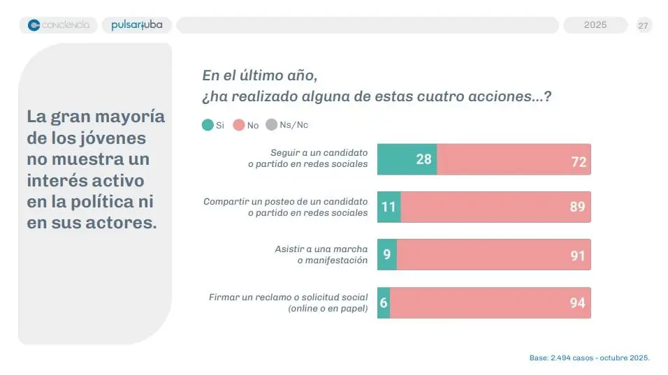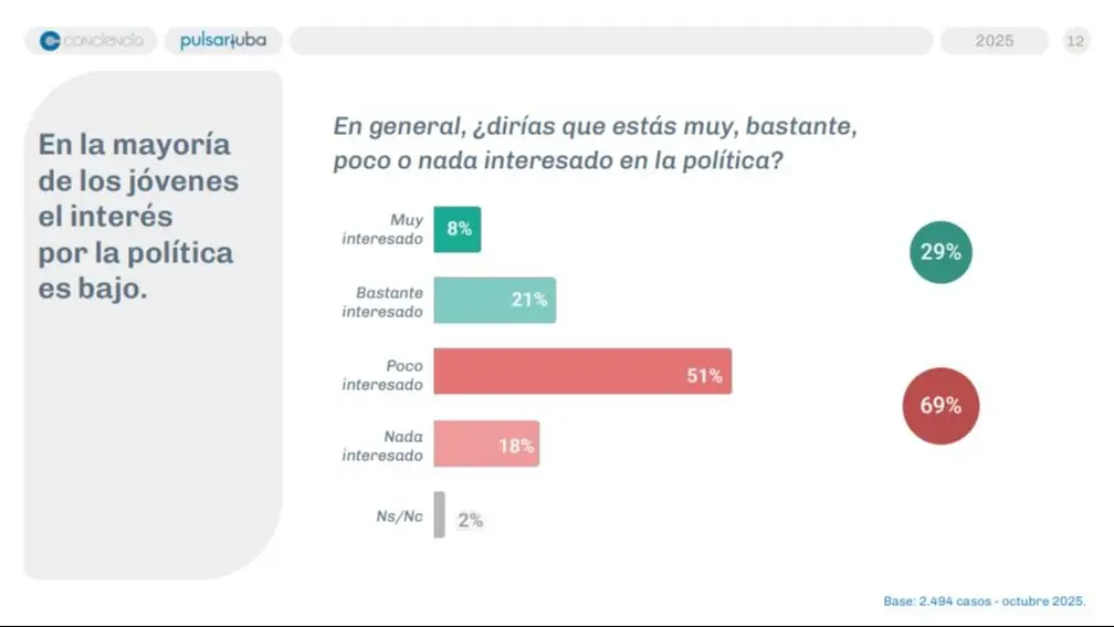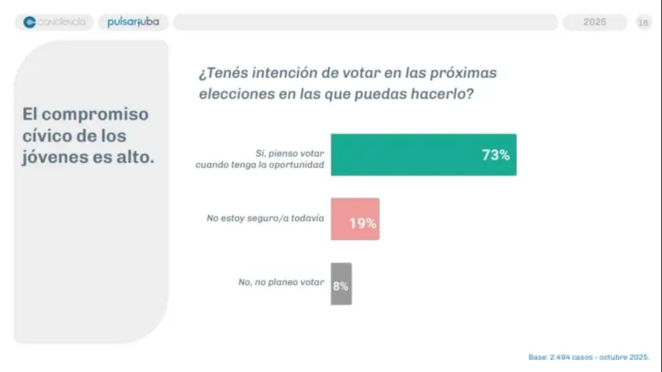 De acuerdo a un trabajo realizado por el observatorio Pulsar de la UBA y la Asociación Conciencia en jóvenes de todo el país, un 69% manifestó estar poco o nada interesado en la política. Sin embargo, un 73% adelantó que irá a votar.