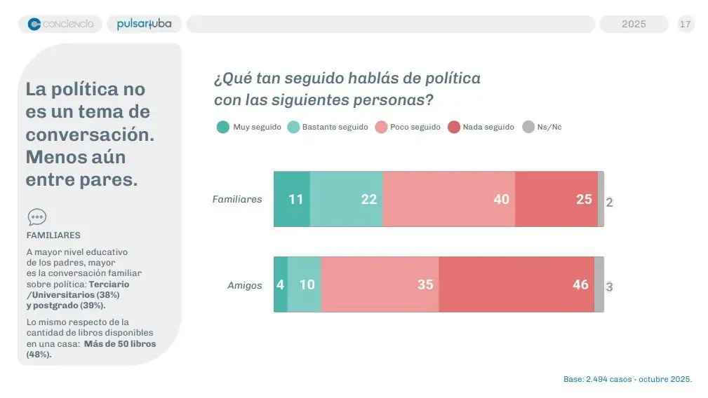 Se trata del primer estudio nacional “Jóvenes: valores, política y democracia”, que se realizó de manera presencial en septiembre y octubre del año pasado entre 2.494 estudiantes de todo el país de entre 16 y 19 años. El trabajo, impulsado por los observatorios de las facultades de Ciencias Económicas y de Ciencias Políticas de la UBA, buscó indagar en el pensamiento de los jóvenes sobre la política y el país. “Los jóvenes ven su presente y su futuro con sentimientos mezclados”, concluyeron. Un 69% dijo estar poco o nada interesado en la política y un minoritario 21% se mostró muy o bastante interesado en la situación nacional. “El poco atractivo que despierta la política es un rasgo extendido entre los jóvenes. Sin embargo, este vínculo no es homogéneo: el interés aumenta entre quienes provienen de hogares con mayor capital educativo, lo que sugiere que el entorno familiar influye en la forma en que los jóvenes se relacionan con la política”, diagnosticaron.