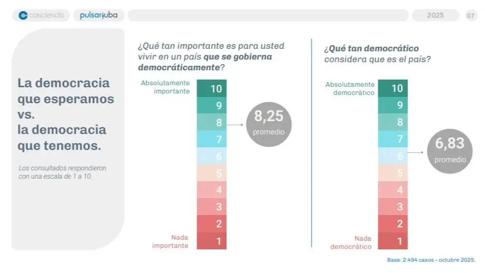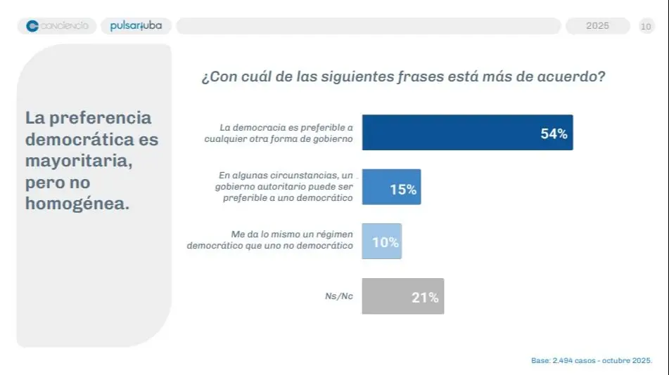 A los jóvenes les interesa poco la política, pero mayoritariamente aseguraron que irán a votar en las elecciones del año que viene, según los datos reunidos en un trabajo realizado conjuntamente por el Observatorio Pulsar de la UBA y la Asociación Conciencia. Muy pocos, apenas un 9%, asistió a una marcha o manifestación en el último año. Tan solo un 54% consideró la democracia preferible a cualquier otra forma de gobierno, mientras que un inquietante 15% cree que, en determinadas circunstancias, puede ser preferible un gobierno autoritario. También resultó alto el porcentaje de quienes no tienen una opinión formada.