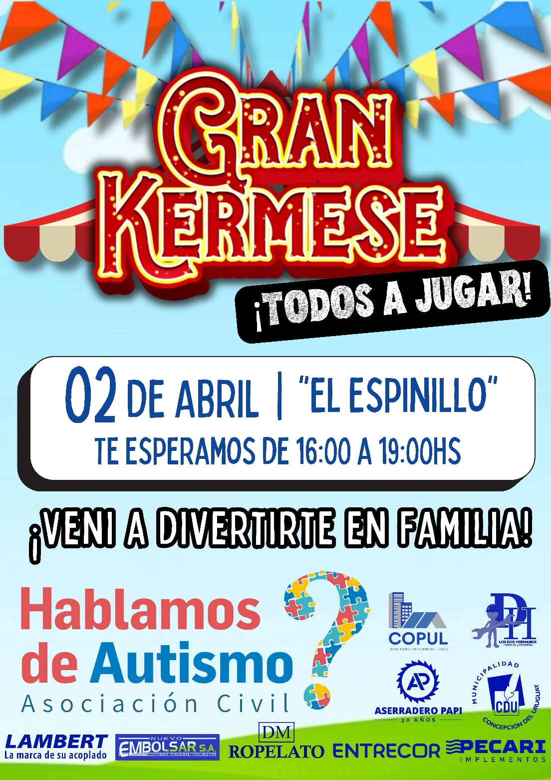 En el marco del Día Mundial de la Concientización sobre el Autismo (2 de abril), la Asociación Civil Hablamos de Autismo invita a la comunidad a participar de una kermés familiar abierta y gratuita, que se llevará a cabo en el predio El Espinillo, de 16:00 a 19:00 horas.