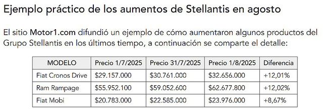 Según supo Noticias Argentinas, el Grupo Stellantis -que agrupa a marcas como Peugeot, Citroën, DS, Fiat, Jeep y Ram- fue la punta de lanza de esta movida: el jueves 31 de julio aplicó una serie de aumentos de entre el 5% y 7% en los precios de sus principales vehículos, mientras que hoy viernes 1° de agosto volvió a subir los precios tras la disparada del dólar. Si se compara con los valores que comercializaba a principios de julio, el aumento de Stellantis es del 12%.