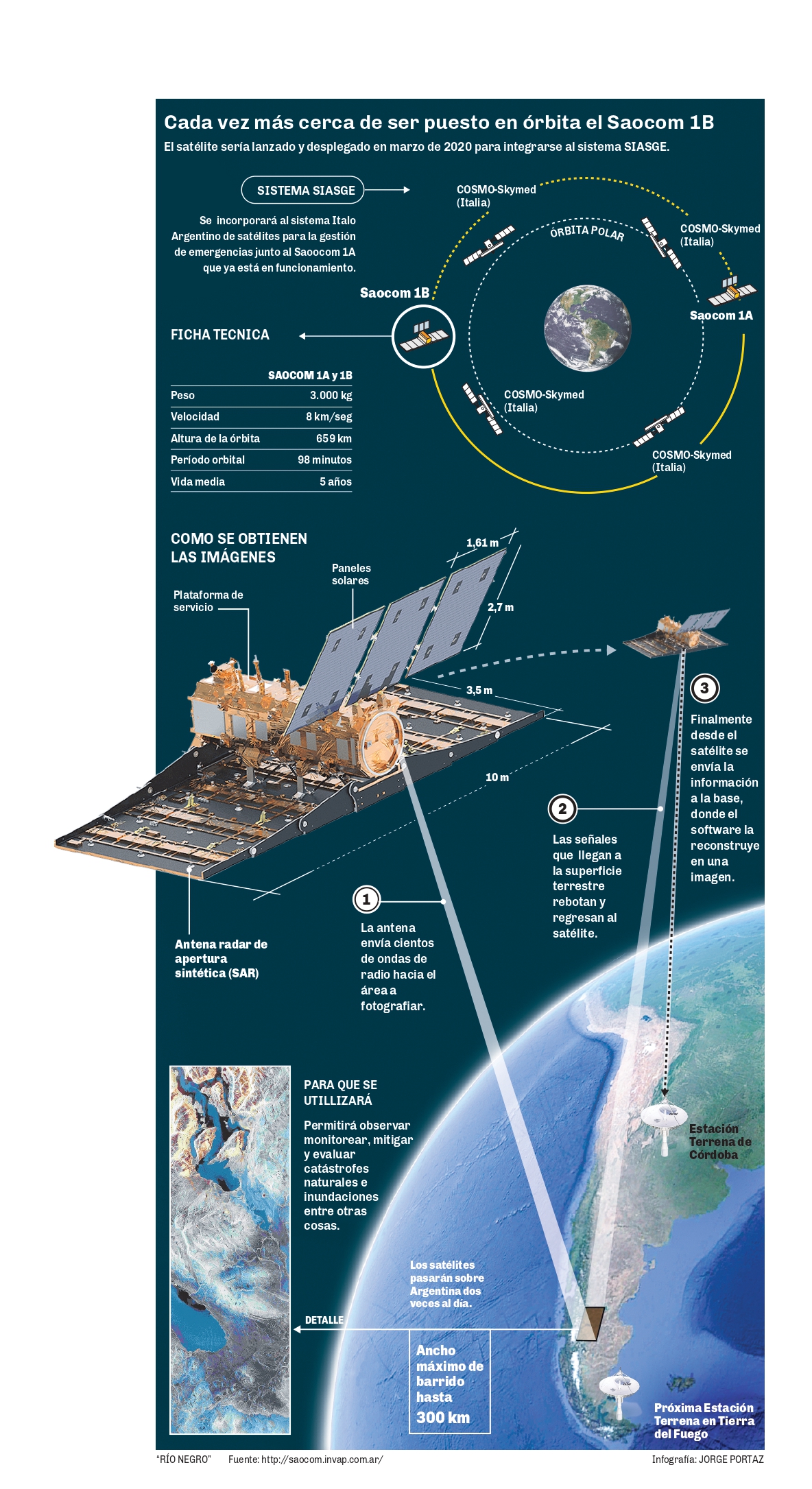 Junto con otros dos aparatos los Saocom (el 1A ya está en el espacio) conforman el Sistema Ítalo Argentino de Satélites para la Gestión de Emergencias, gracias a un acuerdo con la Agencia Espacial Italiana.