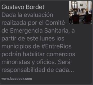 «Dada la evaluación realizada por el Comité de Emergencia Sanitaria, a partir de este lunes los municipios de #EntreRios podrán habilitar comercios minoristas y oficios. Será responsabilidad de cada autoridad local controlar el cumplimiento de los protocolos sanitarios.